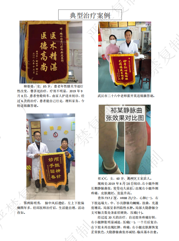 柯XX,女,52岁,黄冈市黄州区路口戚家岭人,患颈椎病、腕管综合征多年,曾多地医治,无明显效果,于2020年3月来我处就诊,经我处治疗,症状基本消失,临床治疗全愈,今特意送锦旗答谢。